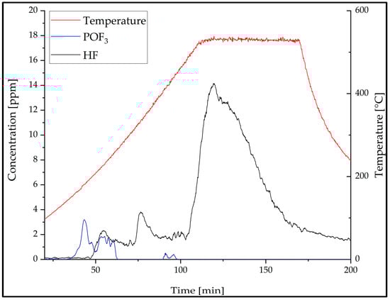 The concentration of HF and POF3 over pyrolysis time in small-scale experiments under N2 with 10 g LIB shredder, exemplary for one temperature and holding time.
