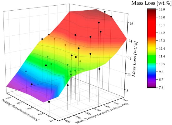 | Max. Temperature Pyrolysis [°C] | Holding Time Pyrolysis [min] | Weight Loss [%] |