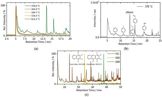 The pyrolysis-GC-MS measurement of the <90 µm fraction of pyrolyzed samples: (a) comparison of GC-MS results for samples pyrolyzed at different temperatures; (b) detailed organic analysis of the sample pyrolyzed at 376 °C; (c) the fingerprint of PVDF decomposition products compared to total ion chromatogram of the sample pyrolyzed at 376 °C.