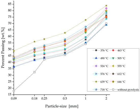 Furthermore, the particle-size distribution of the pyrolyzed battery shredder can indicate binder removal and the delamination of collector foils. Therefore, it differs according to the pyrolysis parameters. In Figure 8, it can be seen that a pyrolysis temperature of 376 °C led to a higher percentage of the fine fractions smaller than 0.09 and 0.18 mm compared to the untreated material. Contained organics from the electrolyte and binder cause the sticking of active mass particles and hinder the delamination of the collector foils. Except for the untreated material, the curves show similar characteristics but are shifted in parallel to higher passing percentages with pyrolysis temperature. Lombardo et al. [] observed a similar behavior for the delamination of pure cathode foil production scrap after thermal treatment between 450 and 650 °C, but without giving a grain size distribution. Exceptions of the trend in the present study are the samples treated at 646.3 and 717.9 °C. These curves lie under the sample treated at 638.5 °C. This is due to the agglomeration of metals and active mass during the trials close to and above the melting point of aluminum (660 °C) [].