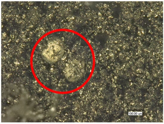 A light microscope image of a <500 µm fraction from the pyrolysis trial at 718 °C with molten particles.