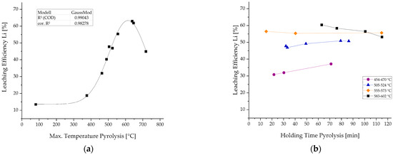 In comparison to the huge effect of pyrolysis temperature, the holding time (Figure 11b) shows no great influence on the lithium LE, especially in the elevated temperature ranges from 500 to 570 °C. In higher temperature ranges around 600 °C, longer holding times result in a slight decrease in the leachability of lithium. This may be caused by slow reactions of lithium with aluminum to insoluble lithium aluminates, which were found in a study by Hu et al. [] to be formed between 650 and 900 °C. In contrast, longer holding times in lower temperature ranges between 454 and 470 °C seem to be favorable for higher LE. However, due to the experimental setup, exact temperature adjustment was not possible during the pyrolysis trials. This leads to the given temperature ranges in which the holding times are compared with each other. Especially in the low-temperature range, the difference of 16 °C could have a higher influence on the results than the holding time, which makes the interpretation difficult in this case.