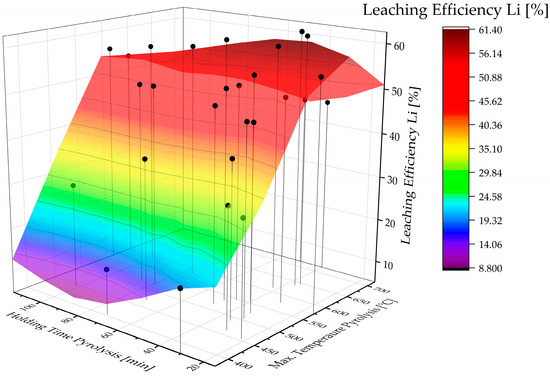 For a more holistic investigation and interpretation of the influence of pyrolysis parameters on the leachability of lithium, Figure 12 shows a 3D plot with a modeled surface for all recorded data points. This modeling confirms the significantly greater influence of pyrolysis temperature compared to holding time on the lithium recovery. Balachandran et al. [] and Roquette et al. [] found a similar correlation between the pyrolysis parameters and the LE of lithium for NMC material.