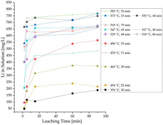 To further investigate the leaching behavior of Li, additional leaching trials were carried out with sampling over time. The leaching of Li is quick, so in most cases, the largest amount of Li (up to 98% of final Li concentration) is already dissolved after 15 min, as shown in Figure 13. Afterwards, just a slight increase in Li concentration is measured. This indicates that the accessibility of formed water-soluble Li-compounds for the leachate is not dependent on the given range of thermal treatment parameters. Roquette et al. found similar kinetic behavior for their lower Ni-containing NMC material.