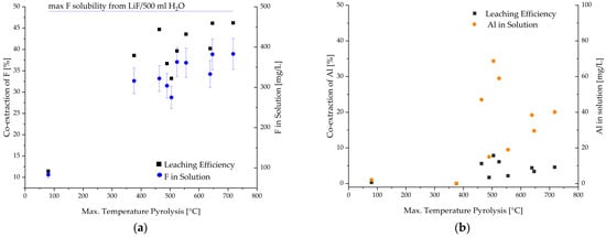 The analysis of the leaching solution regarding further battery elements besides lithium did not reveal any detectable contents of cobalt, nickel, manganese and copper. However, the solution contains significant amounts of aluminum and fluorine (Figure 14). In the case of dried material at 80 °C, just 83 mg/L F is detectable due to the dissolution of F-containing salts. With rising pyrolysis temperature, more F-containing salts, especially LiF, are released during the thermal treatment (see sections above) and leached afterwards, but no clear trend according to pyrolysis temperatures above 375 °C can be determined. Due to the complexity of F analysis, the deviation is estimated to be 10%. The theoretical possible maximum F amount in water from LiF is not reached in any of the trials. It remains to be clarified if this is due to accompanying elements and the basic pH value of the solution.