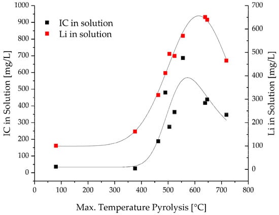 In addition to the co-extraction of further battery elements, the inorganic carbon (IC) in solution was determined. Figure 15 shows a plot of IC concentration in comparison with Li concentration in the leach solution depending on the previous pyrolysis temperature. Both graphs have a similar course, where the concentration rises rapidly above 375 °C and is nearly linear. Both curves reach a maximum but at different temperatures of 572 °C (IC) and 614 °C (Li). It was expected that the curves would be parallel because the Li in the solution mainly originates from Li2CO3, and F-leaching is nearly constant. Possible explanations could be necessary improvements in the new application of IC measurement in battery recycling and sample stability. Moreover, Li could be present in solution either as carbonate or as hydrogen carbonate, resulting in different IC concentrations. But overall, both curves show good agreement in the observed trends. Therefore, IC measurement in solution is a promising tool to evaluate the Li2CO3 content of a black mass sample.