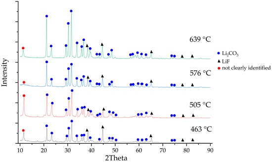 Further minor impurities in the salt are S and Na, and in the samples treated at 463 °C and 505 °C, P is detected (see Table 3). P could originate from the decomposition products of the conducting salt LiPF6 and small amounts of dissolved Li3PO4, which was detected in some XRD patterns of the black mass and has a slight water solubility of 0.27 g/L []. It could have formed by the reaction of Li2CO3 with phosphoric acid, which is formed during the decomposition of LiPF6 according to Equation (7). Traces of S and Na were detected by Peschel et al. [] in the input shredder material as well and are explained to originate from S-containing electrolyte additives and CMC binders applied as sodium salt. Those minor impurities have not been addressed in previous studies but state the influence of low share battery components on product purity in the recycling chain.