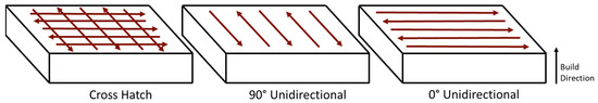 Laser-directed energy deposition (DED) is one common type of metal AM, which deposits metal powder, or wire, through a nozzle onto a build plate. A laser source simultaneously melts this powder in an inert atmosphere, typically argon, by creating a melt pool on top of the substrate [1,10,11]. The bed moves while the laser and nozzle stay stationary, or, in some instances, the laser and nozzle move, and 3D construction can take place. The scanning path, or specific movement of the bed, is a parameter defined by the user. Multiple nozzles can be used, which allows the DED process to produce multi-material parts as needed [1,11]. DED has high deposition rates and can produce parts and clad or repair existing parts. Its ability to produce parts to exact dimensions specified in the CAD files (especially when additive and subtractive approaches are used in combination) is important in medical, aerospace, or military industries, for example, where exact dimensions are crucial for component performance [11]. Additive strategies also reduce material consumption and improve manufacturing sustainability.