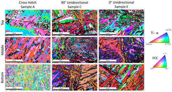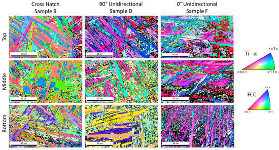 Three EBSD scans were taken per additive sample as pictured in Figure 2, near the top, middle, and bottom of the specimen. Orientation maps, often referred to as inverse pole figure (IPF) maps, can be seen in Figure 3 and Figure 4 for 500 mm/min and 1000 mm/min scanning speeds, respectively. The IPF color key refers to orientations that are aligned with the sample normal direction (transverse to the build direction of the AM specimens). IPF maps show a transformation structure, as expected. The EBSD data have been filtered so that all orientations shown have a confidence index of at least 0.1 (CI > 0.100). There was also a grain confidence index standardization cleanup, with a grain tolerance angle of 5 and minimum grain size of 5. No other data manipulation was performed.