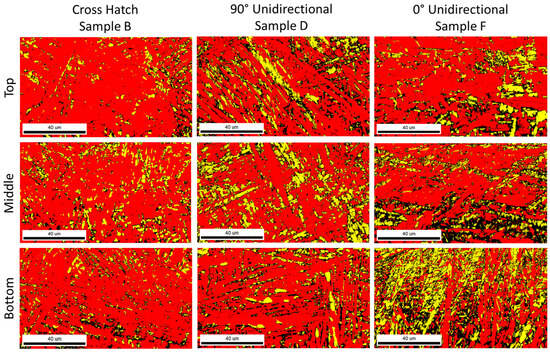 Phase maps can be seen in Figure 5 and Figure 6, showing both Ti-α and FCC phases, labeled as red and yellow, respectively. There is more FCC phase present in the unidirectional scanning patterns for the slower scanning speed samples. When comparing the IPF maps with the phase maps, the FCC phase consists mainly of one orientation, while the Ti-α phase contains many orientations (all corresponding to the expected BCC to HCP orientation relationship).