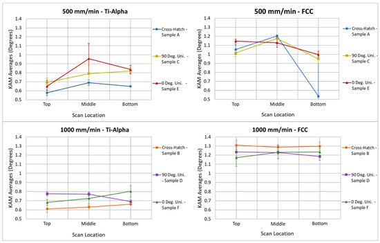 Plotted KAM averages for each phase, scan speed, scan pattern, and sample location are seen in Figure 9. Three regions were analyzed for each measurement and the KAM averages for each area were found. The standard deviation was calculated from these averages, and error bars were created and shown on Figure 9. When only looking at the slower scanning speed (500 mm/min) results, the Ti-α phase has lower KAM values than the FCC phase. Additionally, the top scans for the Ti-α phase (higher in the build sequence) have the lowest KAM values for each individual sample of this scanning speed. This means there is more lattice curvature in FCC and less in Ti-α near the top of the specimen. It is likely that part of the reason that the FCC phase formed was from geometrical restrictions that impeded formation of the HCP phase. In this reasoning, it is reasonable that there may be more lattice curvature in the FCC phase, resulting from, and contributing to, the residual strains in the lattice at that point.