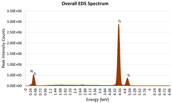 EDS element maps were identical for all samples, showing a uniform distribution throughout the region. There is no difference or clear distribution of nitrogen between Ti-α and FCC phases. One EDS spectrum showing titanium and nitrogen peaks is presented since all spectra for all samples looked similar, with only small variations in the weight percent of nitrogen. EDS is not the most dependable characterization method because of its surface sensitivity confined to approximately 1 μm of depth [38]. Additionally, certain peaks within EDS spectra may overlap with one another, making it difficult to properly determine quantitative values. This is particularly the case with titanium and nitrogen peaks. It is also less effective at identifying trace elements, meaning elements of low concentrations. However, it provides detailed multielement detection, with a spatial resolution on the order of a micron [38].