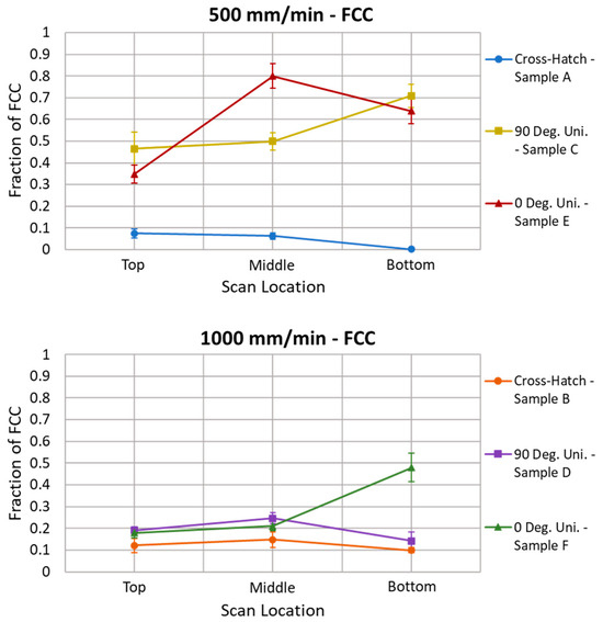 In this current work, there is more FCC found in slower-scanning-speed specimens. Since it is assumed from the previously introduced complimentary studies that the BCC-to-FCC transformation is highly affected by the volume energy density, and that more FCC was found in higher laser powers, perhaps the combination of laser power and slow scanning speed in this study created the stress conditions conducive for FCC to form. The FCC phase specifically is more prominent in unidirectional scanning patterns for the slower scanning speed specimens, represented in Figure 11. The cross-hatched pattern has approximately the same amount of FCC for both scanning speeds. This shows that differences in scanning patterns may impact the formation of the FCC phase as well.