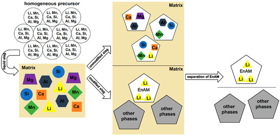 Sketch of the strategy behind EnAM experiments. The aim is to use a suitable synthesis route to produce a homogeneous precursor in which the elements are evenly distributed. After determination of the melting point, the precursor is melted. The individual phases crystallize out of the liquid slag. After the analysis of the slag has been completed, the experiment can be optimized (e.g., temperature, atmosphere, cooling rate, pressure) so that Li is present in a single phase (ideally an early crystallizate), which can be easily separated from the rest of the slag (matrix).