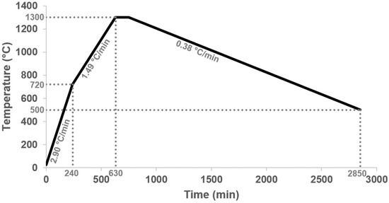 The treated precursors were melted under a normal atmosphere in Pt/Rh crucibles in a chamber furnace (Nabertherm HT16/17, Nabertherm GmbH, Lilienthal, Germany). For the melting process, the program from Schirmer et al. [13] and Wittkowski et al. [11] was adapted (Figure 2).