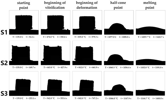 The beginning of vitrification is the temperature at which agglutination occurs at the interface of the particles. With the beginning of deformation, the first signs of softening, such as a change in the surface, occur on the cube. The half-cone point is the point at which the sample is only half as high as its baseline. At the melting point, the temperature is reached at which the sample flows apart. S1 has the highest melting point at 1205 ± 5 °C, S2 has the lowest at 1102 ± 5 °C and the melting point of S3 is 1144.7 ± 5 °C. (Figure 3).