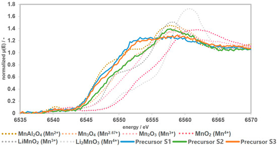 The reference materials show a shift of the edge to higher energies with an increase in the oxidation state of Mn. The Li-manganates show a characteristic main-edge shoulder. The edge shift and the shape of the curves of the precursors S1 and S3 indicate an oxidation state of Mn2+ with a small trend towards Mn2.67+. Precursor S2 shows greater tendencies towards an oxidation state of Mn2.67+ (Figure 4).