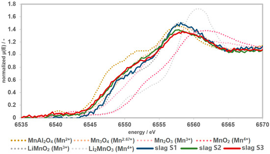 The K-edges of slag samples S2 and S1 are shifted further to higher energies. Accordingly, the highest average Mn oxidation state should be present in S1. In the spectrum of S1, the characteristic main-edge shoulder of Li-manganate(III) (LiMnO2) can be detected. Compared to the references, the spectrum of S1 is similar to that of LiMnO2, with tendencies towards Mn3O4. The shifting and shape of the curves S2 and S3 are similar to Mn3O4. In relation to the slag samples, the spectrum S3 shows the lowest oxidation state (Figure 5).