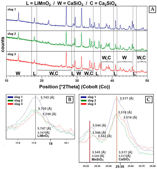 The Li-manganate reflexes are best described by the diffraction pattern of LiMnO2 (ICDD PDF2 00-035-0749) (Figure 6B). Due to line overlays with wollastonite, the presence of hausmannite (ICDD PDF2 00-024-0734) was not clearly verifiable. In the slag-forming phases (wollastonite, larnite), Ca can be replaced by Mn due to comparable ion radii [35]. Therefore, a solid solution between Ca-silicates and Mn-silicates can be expected (Figure 6C).