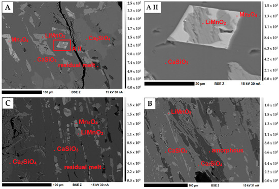 According to this, the Mn in the precursor, which has an average oxidation state of Mn2.67+ (XANES, Figure 4), must be oxidized to Mn3.5+ (Equations (1) and (2)) or Mn4+ (Equations (3) and (4)), respectively, during the high temperature part of the melting experiment. From the observations, these phases decompose during solidification (cooling) with the release of oxygen due to the normal atmospheric conditions (see also Longo et al. [32]). Due to the more or less cubic crystal form of the LiMnO2 and Mn3O4 intergrowths (Figure 7A II), it is reasonable to suggest that a spinel (Equations (1) and (2)) has decomposed. There is an indication that Li and Mn can be replaced to a limited extent by each other within the LiMnO2, leading to a formula like Li1–xMn1+0.33xO2 or Li1+xMn1–0.33xO2 (Figure 9).