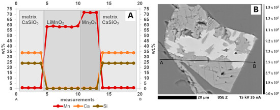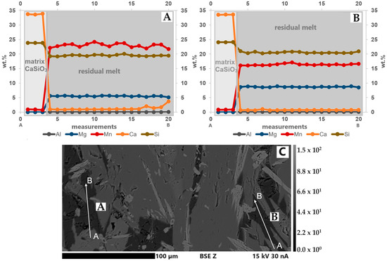 In every slag sample, there was a residual melt, which was located in interstices and fissures. The elements in this phase were not homogeneously distributed. The concentration of elements (e.g., Mg, Mn) in different grains in the respective slag samples also varies (Figure 11A,B). Thus, it was not possible to calculate a stoichiometric mineral formula for this phase. Furthermore, it was not possible to make statements about the possible Li content within this structure as well as the ratio between Mn2+/3+. The BSE(Z) image shows where the line scan measurements were taken in the S3 thin section (Figure 11C).