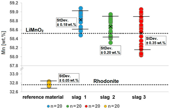 The average value of Mn content in the investigated LiMnO2 grains over all three synthetic slag samples is in S1 58.82 wt.% ± 0.18, in S2 58.67 wt.% ± 0.20 and in S3 58.53 wt.% ± 0.35. In LiMnO2, the theoretical Mn content is 58.52 wt.% (Figure 9).