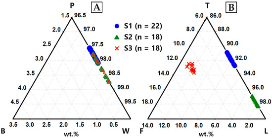 B: birgmanite (MgSiO3), P: pyroxmangite (MnSiO3), W: wollastonite (CaSiO3), F: forsterite (MgSi2O4), T: tephorite (MnSi2O4), L: larnite (CaSi2O4)). (A) Up to 3 wt.% Mn was incorporated into the crystal lattice of CaSiO3. (B) Comparatively more Mn (max. 9.05 wt.%) was incorporated into the structure of Ca2SiO4 and additional Mg (max. 5.76 wt.%).