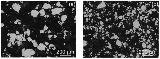Figure 1 shows images of powder particles (granules) of the composites studied in the plane of the section after mechanical alloying. These granules were formed through repeated alternating processes of welding and the destruction of powder particles during milling as a result of severe plastic deformation. These processes take place under the impact and abrasion of the milling balls. From Figure 1a, it can be seen that the edges of the Al-10% Al2O3 granules were uneven and their size was about 100 μm. At the same time, with the addition of 5 wt% Zr, the shape of the granules became more regular and their average size decreased to about 40 μm, indicating the development of greater work hardening in this material and the predominance of the destruction mechanism.
