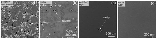 Porosity of Al-10%Al2O3-5%Zr after hot pressing (a,b) and MDF (c,d) at the periphery (a,c) and center (b,d).