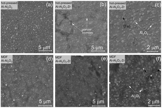 The residual porosity was significantly higher at the surface of the samples after hot pressing for both alloys studied, while a high porosity was defined at the periphery of the samples and a smaller fraction in the center (the example for the Al-10%Al2O3-5%Zr material is shown in Figure 2a,b). At high magnification, the boundaries between the granules were observed (Figure 3b). The subsequent MDF resulted in a strong decrease in porosity and discontinuities along the granule boundaries in both the central and peripheral parts of the samples (Figure 2c,d and Figure 3d,e), indicating the increase in sample quality. Meanwhile, some residual discontinuities were detected in the Zr-bearing material. The porosity reduction also supports the density change analysis. The density of the samples increased from 2.47 to 2.73 g/cm3 and from 2.69 to 2.81 g/cm3 for samples without Zr and with Zr addition, respectively.
