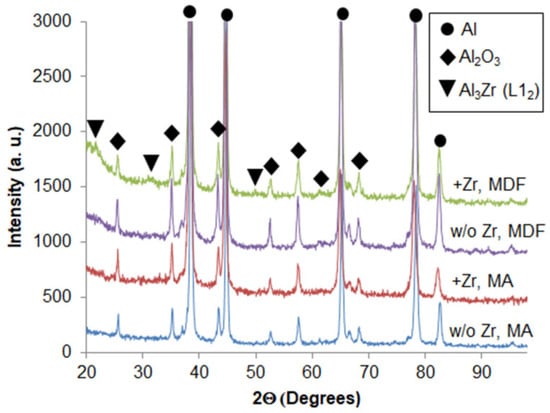 Traditional aluminum alloys can no longer meet the increased demands of modern products operating in harsh conditions. Important alloying elements for heat-resistant aluminum alloys are transition metals, such as zirconium [,,,]. However, their limiting solubility in aluminum is extremely low, which reduces the strengthening potential of the alloys. For the manufacturing of critical parts operating under extreme conditions, aluminum matrix composites can be used instead of aluminum alloys. Aluminum matrix composites have a number of advantages, including high strength properties at both ambient and elevated temperatures [,,,,,,]. Traditional reinforcing phases in composites are ceramic particles, such as Al2O3, which are characterized by high hardness and melting temperatures []. Al-Al2O3 composites are produced using various methods, including stir casting [,], gas pressure infiltration [,], ultrasonic casting [,], squeeze casting [], semi-solid mechanical stirring [], powder metallurgy [] and mechanical alloying [,,,,,,,,,]. Mechanical alloying [,,,,,] is the most effective method for forming a homogeneous ultrafine structure. This method makes it possible to achieve a uniform distribution of reinforcing particles in a metal matrix as a result of alternating processes of welding and the destruction of powder particles of processed materials during ball milling. At the same time, the severe plastic deformation that accompanies the mechanical alloying process leads to the formation of a nanocrystalline structure that provides high strength properties.