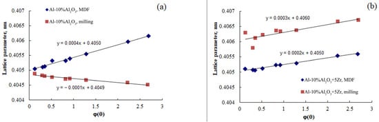 It should also be noted that in all but one case, the slope of the extrapolation line in Figure 5 was positive. However, for the Al-10%Al2O3 material in the as-milled state, this slope was negative, and it was associated with a decrease in interplanar spacing. This may be due to compressive deformation of the crystal lattice as a result of severe plastic deformation during the milling process. For the Al-10%Al2O3-5%Zr material, this phenomenon is likely to be compensated for by an increase in interplanar spacing due to the dissolution of zirconium, and hence, the line slope is positive for this material.