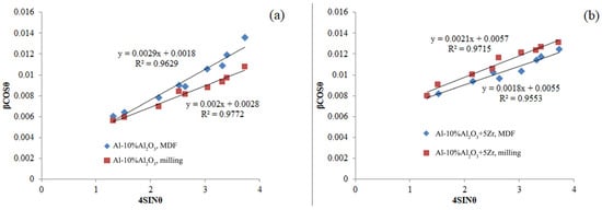 The Williamson–Hall plots for (a) Al-10%Al2O3 and (b) Al-10%Al2O3-5%Zr composites.