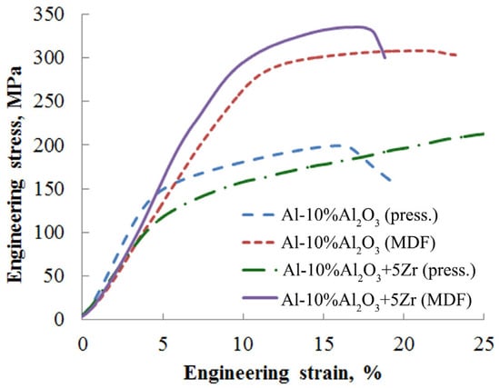 Compression diagrams for compact samples obtained after hot pressing and MDF are shown in Figure 7. It can be seen that the compression curves for the forged samples were significantly higher than those for the pressed samples. This indicates that forging results in a significant increase in strength compared to pressing, due to a higher degree of densification. Meanwhile, the ductility of the Zr-added material was slightly lower than that of the Al-10%Al2O3 material. This may be due to the retention of discontinuities in the microstructure due to the higher microhardness of the powder and smaller particle size. It should also be noted that although the microhardness and calculated yield strength at room temperature were higher for the Al-10%Al2O3-5%Zr material compared to Al-10%Al2O3, the yield strength at 350 °C was approximately the same for both materials and was approximately 220 MPa, which is a very high heat resistance index. It is evident that the alumina particles, which are inert to the metal matrix, make a significant contribution to the creep strength compared to the inhibition of dislocation motion at room temperature. In addition, high temperature strength is achieved with a grain size of less than 100 nm, indicating that there is no contribution from diffusion creep. The lack of a difference in the yield strength may be due to the fact that in the first material, due to the very small grain size, deformation can occur in the initial phase at elevated temperatures through grain boundary sliding, whereas in the second material, the dislocation strengthening mechanism is mainly involved.