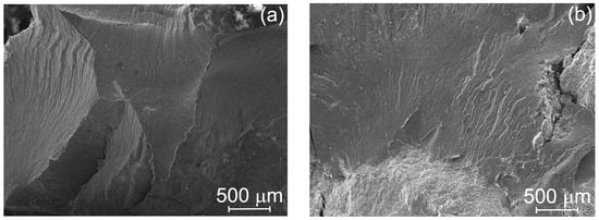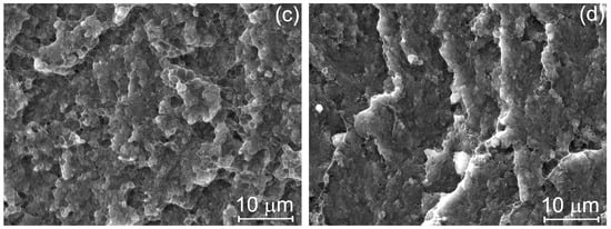 Figure 8 shows the fractographs of the forged specimens after compression testing. At low magnification (Figure 8a,b), a flat fracture surface with traces of plastic deformation can be seen for both materials, indicating a predominantly brittle fracture pattern. However, at a higher magnification (Figure 8c,d), the fracture surface showed a dimpled structure characteristic of ductile fracture. The size of the pits was on the order of 1 µm. They appeared to have been formed through the detachment of alumina particles from the Al matrix. In the Al-10%Al2O3 material, the dimpled structure was more homogeneous than in the Zr-containing material due to a smaller number of defects (larger size of the initial granules). This explains the lower ductility of the latter. Based on the analysis of the presented fractographic images, it can be assumed that brittle fracture along the discontinuities is preceded by ductile fracture within the initial granules.