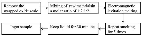 Nb17Zr33Ti17W33 alloy ingots (with each element in a molar ratio of 1:2:1:2) were prepared using industrial-grade Nb, Zr, Ti, and W raw materials (>99.9 wt.% purity) through suspension melting casting technology under the protection of a high-purity argon atmosphere (99.99 mass%). To ensure component element uniformity, the prepared masterbatch underwent a repeated process of flipping and melting for at least 5 cycles, with each cycle maintaining a liquid state for approximately 30 min. The preparation procedure is illustrated in Figure 1. The density of the alloy materials measured by the Archimedes drainage method was 10.98 g·cm−3.