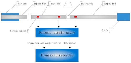 The impact strain rate ranges from 102 s−1 to 104 s−1 when employing SHPB for room-temperature dynamic impact testing. The operational principle involves the air gun firing high-speed bullets to impact the input rod, which in turn strikes the sample and causes deformation. This effect is then transmitted under pressure to the output rod, while also hitting the cache device via an absorption rod. Throughout this process, one-dimensional elastic stress waves are incident, reflected, and transmitted. The three actions were recorded as pulse signals using a highly sensitive strain gauge, capturing essential data, such as loading rate and stress waveform. These signals were then meticulously logged by a computer system. Ultimately, the material’s dynamic stress–strain curve under high-speed load was generated through an advanced data-processing system and an intelligent measurement analyzer. The arrangement of the pressure rod, specimen, and test instrument is illustrated in Figure 2. As a comparison, a quasi-static compression test was conducted by an electronic universal material testing machine with a strain rate of 10−3 s−1. The compressed sample was obtained from an alloy ingot through wire cutting. The quasi-static test sample measured 6 mm × Φ4 mm, while the dynamic test sample measured 4 mm × Φ4 mm.