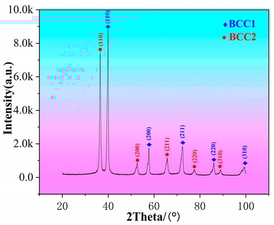 The XRD pattern of the Nb17Zr33Ti17W33 alloy sample is depicted in Figure 3. The results reveal the presence of a body-centered cubic structure (BCC) in the alloy, with no other complex phases being observed. The high mixing entropy effect of the alloy contributes to the enhanced compatibility of its main components, leading to a significant reduction in the system’s free energy and consequently suppressing element segregation trends. When the mixing entropy of the system surpasses the entropy change associated with intermetallic compound formation, it can effectively suppress the occurrence of brittle intermetallic compounds and promote the formation of simple solid solutions. The analysis reveald that the Nb17Zr33Ti17W33 alloy sample exhibits a dual-phase composition, comprising two distinct body-centered cubic structures, namely, BCC1 and BCC2 phases. Shen et al. [16] demonstrated that the presence of tungsten in alloys promotes phase separation, which aligns with the observed phenomenon in this study. The lattice constants corresponding to BCC1 and BCC2 are 3.195 Å and 3.484 Å, respectively. The plane (110) of the alloy exhibits a significantly higher diffraction intensity, indicating a distinct preferred growth orientation. Conversely, the diffraction peak intensity diminishes at larger angles due to variations in atomic sizes and a significant lattice distortion inherent in multi-principal-component high-entropy alloys. Consequently, an increase in the angle results in enhanced slow scattering effects.