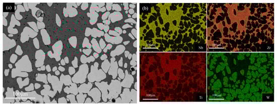 Microstructure (a) and EDS surface scanning results (b) of the Nb17Zr33Ti17W33 high-entropy alloy.