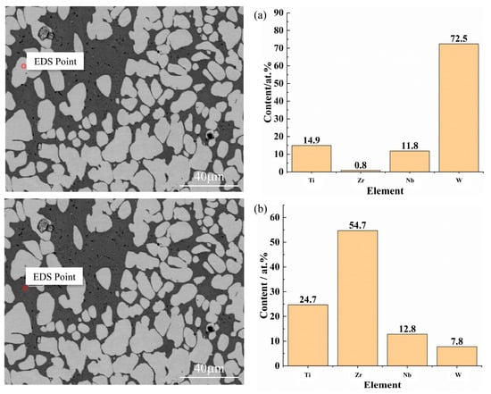 The equilibrium solidification microstructure of the Nb17Zr33Ti17W33 high-entropy alloy in its cast state is illustrated in Figure 4. A microzone EDS analysis was conducted on the bright white and black-gray regions, with the corresponding results being presented in Figure 5. The equilibrium solidified state of the alloy exhibits two distinct types of segregation, as depicted in Figure 4. The bright body exhibits a high enrichment of W element (Figure 5a), with a remarkable content reaching up to 72.5 at.%, while the presence of other elements is significantly limited. The black gray body exhibits an enrichment of the Zr element (Figure 5b), with a composition of 54.7 at.%. The elements Ti and Nb exhibit a dendritic morphology in both phases, displaying a relatively homogeneous distribution. The mixing enthalpies between the W and Ti, Zr, and Nb elements exhibit negative values of −6, −9, and −8 kJ/mol, respectively. The insufficient mixing entropy between the elements fails to counterbalance the negative mixing enthalpy, and additionally, W (Tm = 3422 °C) has a significant difference in melting point compared to other elements, resulting in limited miscibility between W and the other elements. During the solidification process, the W element is incorporated into the dendrites, ultimately resulting in a solid-solution structure that exhibits an enrichment of the W element. The W-rich bright body corresponds to the BCC1 phase due to its smaller lattice constant compared to that of the gray BCC2 phase. The obtained results are in excellent accordance with our deliberate composition design aimed at achieving a simplified solid-solution structure of Nb17Zr33Ti17W33.