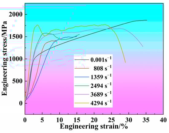 The engineering stress–strain curve obtained from the unidirectional compression test elucidates the dynamic deformation and fracture behavior of the alloy, as depicted in Figure 6. The observed phenomenon of strain rate hardening is significant: as the initial strain rate increases from 0.001 to 4294 s−1, there is an increase in dynamic yield strength from 965 to 1587 MPa, and an increase in compressive strength from 1300 to 1772 MPa. The positive strain rate effect facilitates an enhanced energy absorption during high-speed deformation, thereby promoting the subsequent energy release phenomenon. The sample exhibited coarseness at strain rates of 808 and 1359 s−1, while cracks appeared at a higher strain rate of 2494 s−1 without complete fracture. Upon reaching a strain rate of 3689 s−1, the specimen experienced complete fracture, exhibiting a fracture strength of 1683 MPa and a fracture strain of 27.32%. The alloy exhibits remarkable strength and plasticity at such a high strain rate, surpassing the majority of high-entropy alloy systems with either FCC or BCC structures in terms of comprehensive mechanical properties [17]. The dynamic stress–strain curve of the sample exhibits a significant disparity withthe smooth deformation curve observed during quasi-static loading. In contrast to the smooth deformation curve observed under quasi-static loading, dynamic impact induces a slight decrease in stress after reaching the yield point, followed by entry into the plastic deformation stage characterized by “serrated” fluctuations in stress. The stress rapidly decreases upon reaching its maximum value. The fracture failure of the alloy occurs at a strain level of approximately 38% under static loading, which is about 1.5 times higher than the strain at which dynamic compression failure occurs. The significant disparity between the two arises from the coexistence of strain strengthening induced by the dislocation and thermal softening effect caused by the adiabatic temperature rise during dynamic compression, resulting in a localized temperature elevation and diminished material plasticity. Several scholarly publications [18,19,20] describe this dynamic failure mechanism as adiabatic shear failure resulting from thermo-mechanical instability.