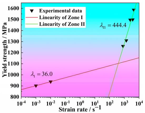 According to Formula (2), when the variation of the absolute temperature and are not significant, the thermal excitation free energy is inversely proportional to the strain rate. For the low strain-rate Region I, the mechanism controlling the plastic flow is frictional stress [22]. A significant quantity of precipitates is observed within the lattice, accompanied by a high thermal excitation free energy. The thermal lattice vibrations are insufficient to overcome these obstacles, and the yield limit remains unaffected by the applied strain rate. Therefore, the yield limit exhibits a greater sensitivity to the strain rate. It has been observed that materials possessing a body-centered cubic crystal structure display a comparable strain rate sensitivity, such as annealed uranium and annealed low-carbon steel [23,24].