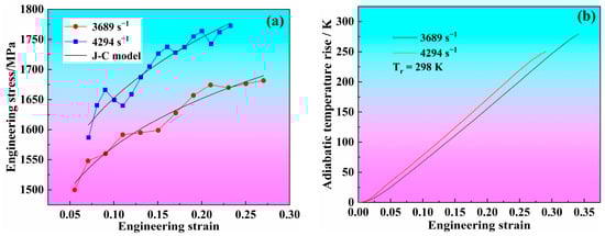 Figure 8a illustrates the comparison between the experimental flow characteristics at different strain rates and the modified J-C model’s calculation results under dynamic compression. Figure 8a demonstrates a strong agreement between the predicted flow characteristics and the experimental curve across various strain rates. As shown in Figure 8b, when the strain rate is 3689 and 4294 s−1, the deformation temperature rise (ΔT) calculated by Formula (4) reaches 279.62 K and 250.04 K, respectively. Strictly speaking, the temperature rise distribution in the material is uneven, but the temperature rise amplitude caused by rapidly moving dislocations may be consistent with the average temperature rise amplitude predicted by the macroscopic model [28]. Based on this consideration, this article assumed that the heat converted from plastic work during deformation causes a uniform temperature rise in the alloy during dynamic loading. The above practice indicates that the improved J-C model can macroscopically predict the flow behavior of materials during a high strain-rate deformation by introducing an average temperature rise.