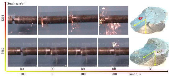 The analysis reveals that the material exhibits a macroscopic ductile fracture, with a significant presence of elongated dimples observed on the fracture surface. During the compression fracture failure process of the sample, strain energy is released and oxidation reactions occur, resulting in the dispersion of sparks. With an increase in the strain rate, there is a corresponding escalation in material fragmentation, leading to a more pronounced manifestation of energy release at the moment of failure. “Melt droplets” are observable on the fracture surface, which is inclined at a 45° angle toward the direction of loading. Shear slip marks within the fracture surface indicate that the alloy fractured in a shear mode, suggesting potential for exhibiting a self-sharpening behavior.