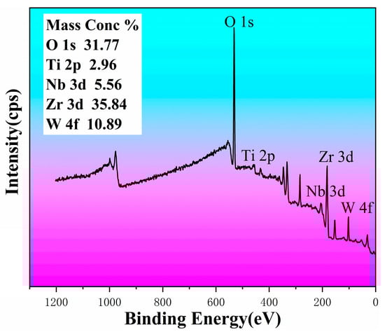 The phenomenon of energy release resulting from alloy specimen failure during the dynamic compression process was captured by the high-speed camera, as depicted in Figure 9. The experiment captured four sequential frames of images both before and after the moment of specimen failure, where the horizontal axis denotes time and the vertical axis represents the strain rate for two distinct failure tests. The moment at which the appearance of sparks was initially observed was designated as time zero. Figure 9a illustrates the frame preceding the release of energy (t = −100 μs). Currently, the SHPB compression rod remains unloaded, and the impact system is in a static state, allowing for a clear observation of the sample’s condition through the acrylic tube. The first observation of the energy release phenomenon (t = 0 μs) is depicted in Figure 9b, where sparks are observed to propagate within a limited range. The deformation energy stored in the fracture is instantaneously released upon material failure, resulting in localized material heating and melting. Simultaneously, an unbalanced stress at the sample’s end causes collision between the hard alloy and the sample, leading to the generation of small material debris. The phenomenon of spark splashing is attributed to the detachment of molten droplets and debris from the block sample, followed by an oxidation reaction with atmospheric oxygen. The oxidation states of various elements on the surface of fragments were analyzed using XPS, as depicted in Figure 10. The peaks corresponding to W 4f, Zr 3d, Nb 3d, Ti 2p, and O 1s were observed at the binding energies of 30.089, 182.089, 203.089, 458.889, and 532.189 eV, respectively, with mass concentration percentages of approximately W (10.99%), Zr (35.84%), Nb (5.56%), Ti (2.96%), and O (31.77%). The XPS data indicate that an oxidation reaction occurred during the impact process, resulting in the formation of predominantly Zr-based oxides, which substantiates the aforementioned phenomenon of energy release. Figure 9c shows the frame after observing the energy release phenomenon (t = 100 μs), where the spark range and brightness are significantly greater than the previous frame. This phenomenon arises from the significant impact, which propels the sample fragments to disperse, thereby inducing vigorous chemical reactions and facilitating the enhanced release of chemical energy upon complete exposure to atmospheric oxygen. As demonstrated by high-speed photography in Figure 9d (t = 200 μs), the strain rate of 4294 s−1 exhibits the most pronounced energy release reaction, a brilliant light emission with the longest duration. The brightness is visible and disappears at t = 30 s. At the strain rate of 3689 s−1, only sparks radiate, reducing the range of fire and lasting for a short time (disappearing at t = 22 s). Figure 9e shows the state of the material after the compression test, with a fracture surface at an angle of approximately 45° to the direction of load loading, indicating that the deformation and fracture direction of the material are the same as the direction of the maximum shear stress. The oxidation reaction and energy release of the Nb17Zr33Ti17W33 high-entropy alloy during high-speed impact can be inferred from Figure 9 and Figure 10. The severity of the energy release effect during material failure is directly proportional to the strain rate within the experimental range.