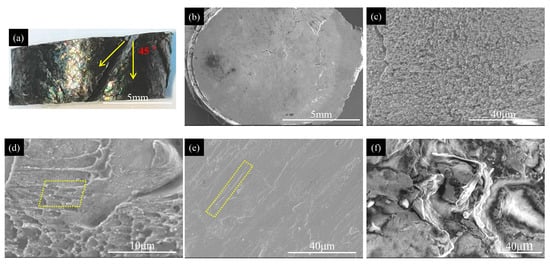 Dynamic compression fracture morphology of the Nb17Zr33Ti17W33 high-entropy alloy: (a) axial small-scale diagram; (b) radial small-scale diagram; (c) dimples; (d) elongated dimples; (e) shear slip line; and (f) melting marks.
