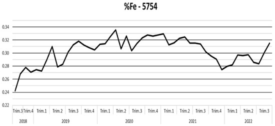 As seen in the graph, the Si content in 5754 products tripled from 0.1% to 0.3% from the third quarter of 2018 to the third quarter of 2022, with a maximum limit of 0.40% according to EN573-3 [17]. Specifically, most of the increase occurred between the fourth quarter of 2018 and the second quarter of 2020, coinciding with an increase in the percentage of external scrap in the melt mix to produce this alloy (from approximately 10% to 50%).