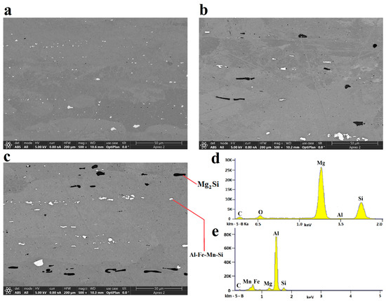 FESEM micrograph with backscattered electron detector (ABS), from left to right, top to bottom (a) Specimen 1, (b) Specimen 2, (c) Specimen 5, (d) EDX microanalysis of a Mg2Si and (e) a constituent (Al-Fe-Mn-Si) (down) from the Specimen 5.