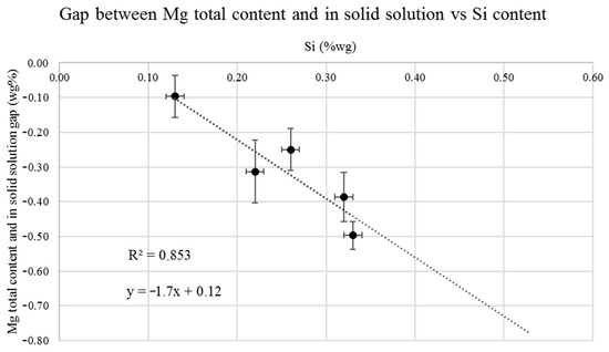 The slope of the equation (Figure 4) approximating the points obtained (−1.7) is close to the one that would determine the stoichiometric ratio of the Mg2Si precipitation reaction (Equation (3)), using the atomic weights of both elements (Si = 28.09 g/mol, Mg = 24.31 g/mol). [34]