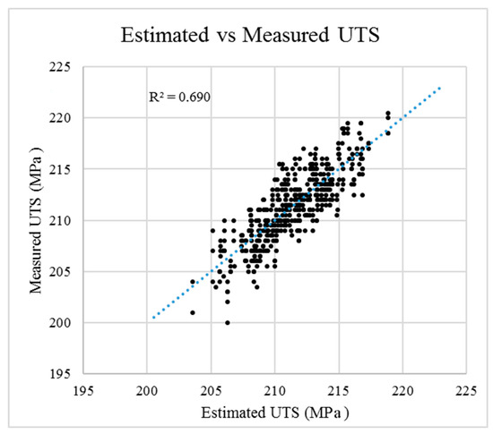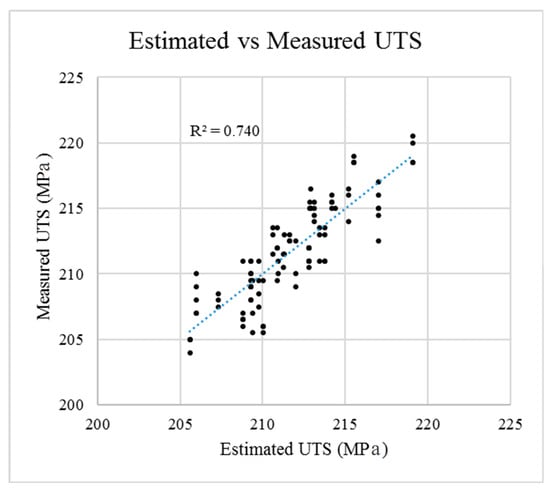 The results obtained by estimating the UTS with Equation (4) and the real data are relatively well correlated (R2 = 0.740), with an average estimation error of 1.6 MPa (Figure 5). This error can be easily explained by other hardening factors, such as variations in the process or deviations from the mean obtained in the mechanical properties tests.